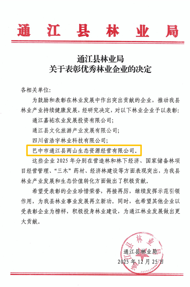 近日,巴中兩山公司被巴中市林業(yè)局通報(bào)表揚(yáng)為2025年度林業(yè)重點(diǎn)工作“表現(xiàn)突出單位”。下屬企業(yè)通江縣兩山公司被通江縣林業(yè)局授予“優(yōu)秀林業(yè)企業(yè)”稱號(hào)。